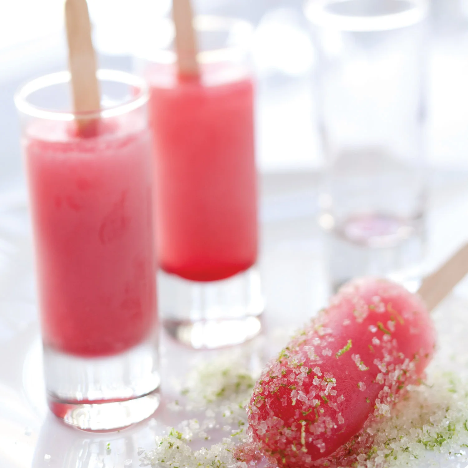 In a small bowl combine 1 1⁄2 cups cranberry juice cocktail, 1⁄4 cup vodka, 1⁄4 cup triple sec, and 1 teaspoon fresh lime juice. Pour 1⁄4 cup mixture into each of 8 small dessert glasses. Freeze about 1 hour until firm. Insert a popsicle stick into each glass, and freeze until solid. Soak in warm water about 30 seconds, and gently twist to remove from glasses. Serve with sugar and lime zest.