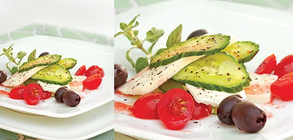 On each of 6 salad plates, arrange 3 feta slices, 6 tomato halves, 4 cucumber slices, 4 olives, and 1 pepperoncini (if using). Drizzle each with 1 tablespoon dressing. Garnish with oregano sprigs, if desired.